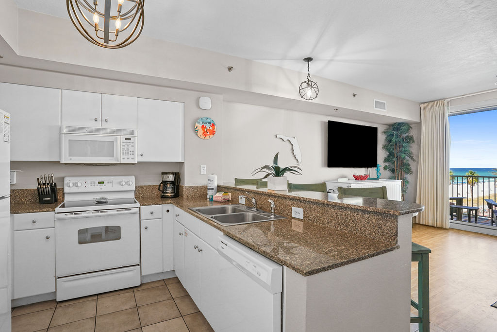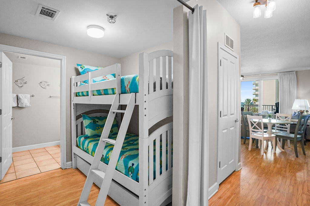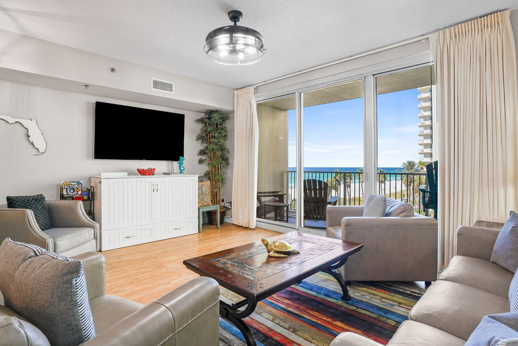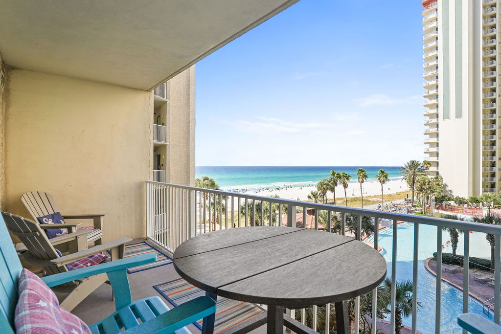 Kick your feet up and take in a breathtaking view of the Gulf waves! This beautiful condo hosts up to 6 guests comfortably! The horseshoe shape of this building allows a unique seclusion from the city outside! From this 4th floor furnished balcony see nothing but the massive lagoon style oasis pool hideaway and the sun over the ocean! The one bedroom unit offers a King bed in the bedroom, Twin bunk beds and Queen sleeper sofa. Full kitchen with essentials, full sized refrigerator and washer and dryer. Fully vacation ready! This condo has same floor reserved parking for no need to use an elevator! Shores of Panama Resort is also right across the street from Walmart, convenient for anything you could possibly need during your vacation!