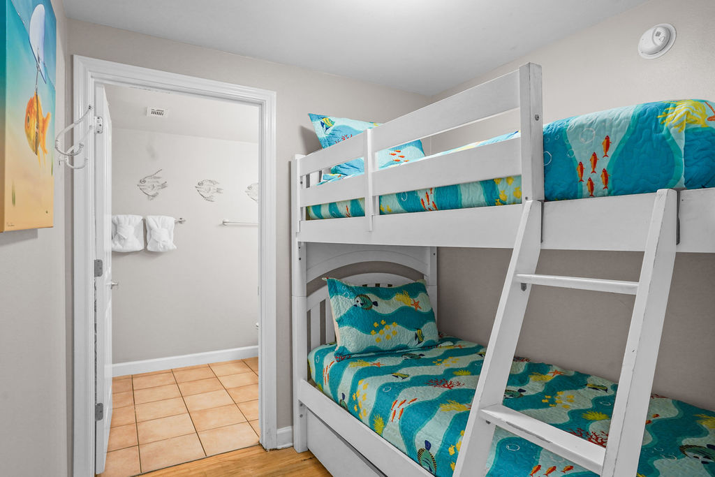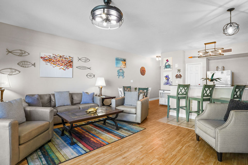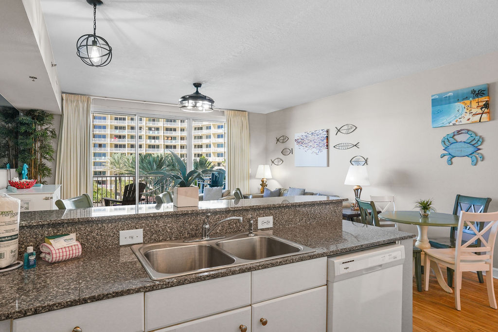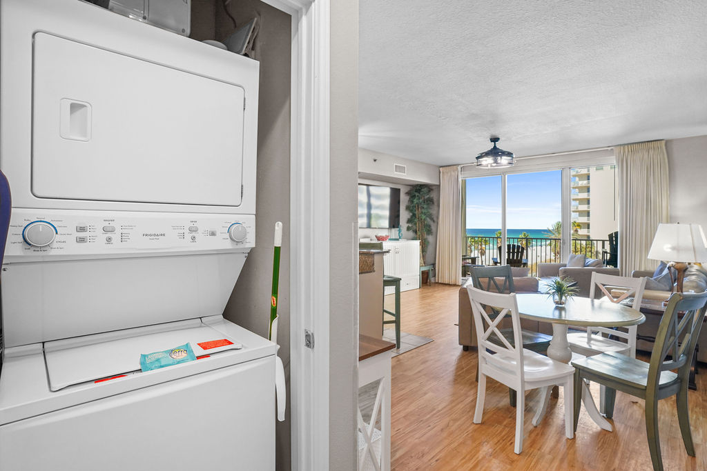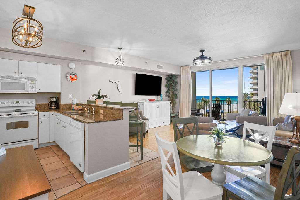 Kick your feet up and take in a breathtaking view of the Gulf waves! This beautiful condo hosts up to 6 guests comfortably! The horseshoe shape of this building allows a unique seclusion from the city outside! From this 4th floor furnished balcony see nothing but the massive lagoon style oasis pool hideaway and the sun over the ocean! The one bedroom unit offers a King bed in the bedroom, Twin bunk beds and Queen sleeper sofa. Full kitchen with essentials, full sized refrigerator and washer and dryer. Fully vacation ready! This condo has same floor reserved parking for no need to use an elevator! Shores of Panama Resort is also right across the street from Walmart, convenient for anything you could possibly need during your vacation!