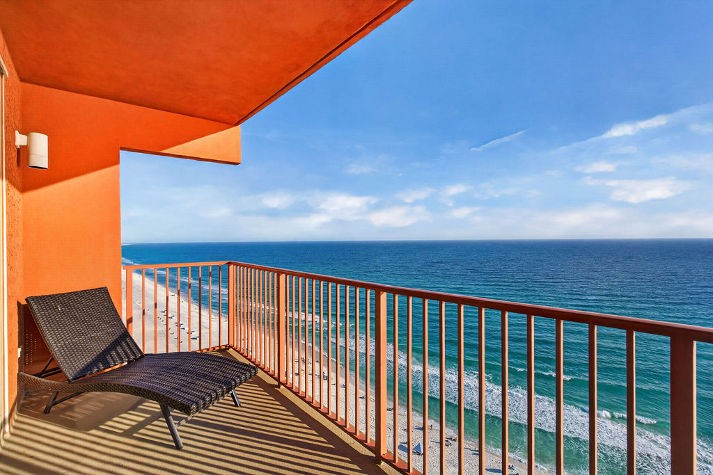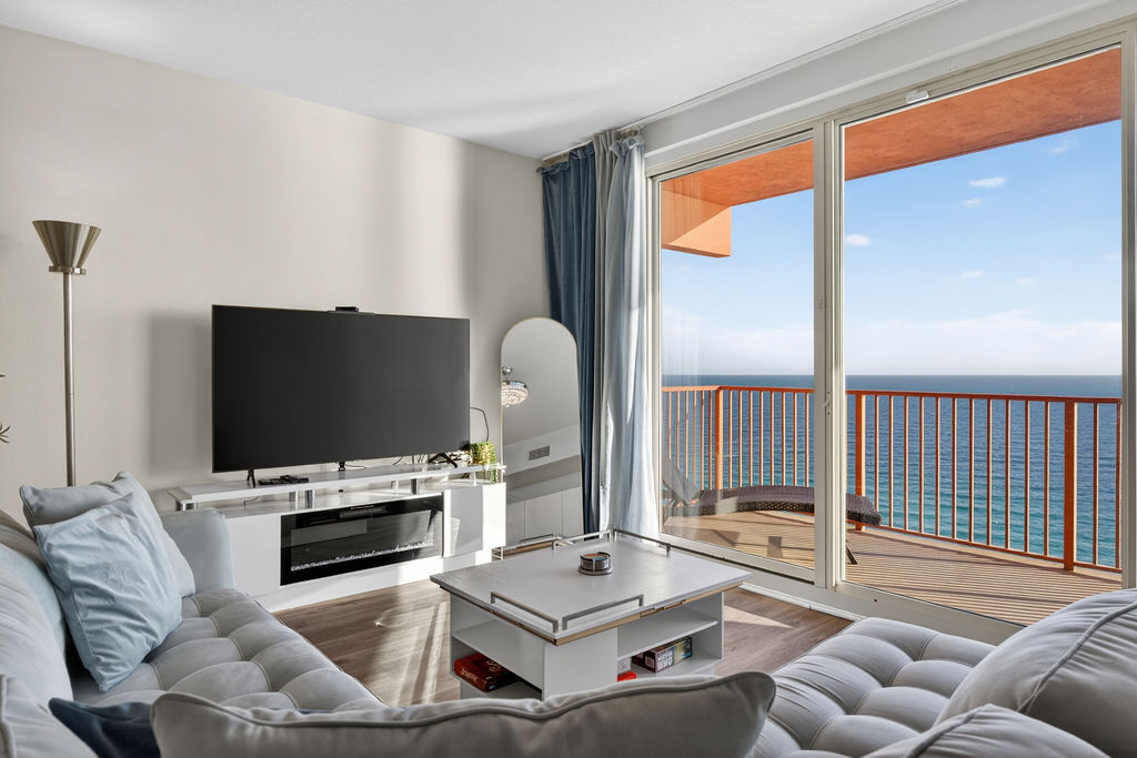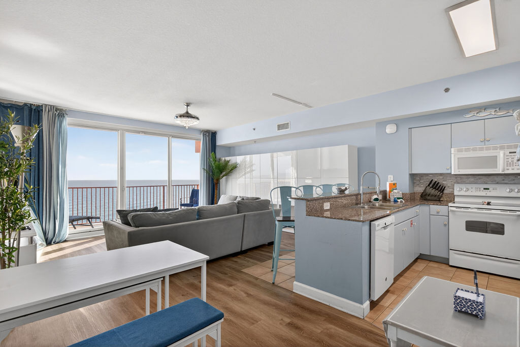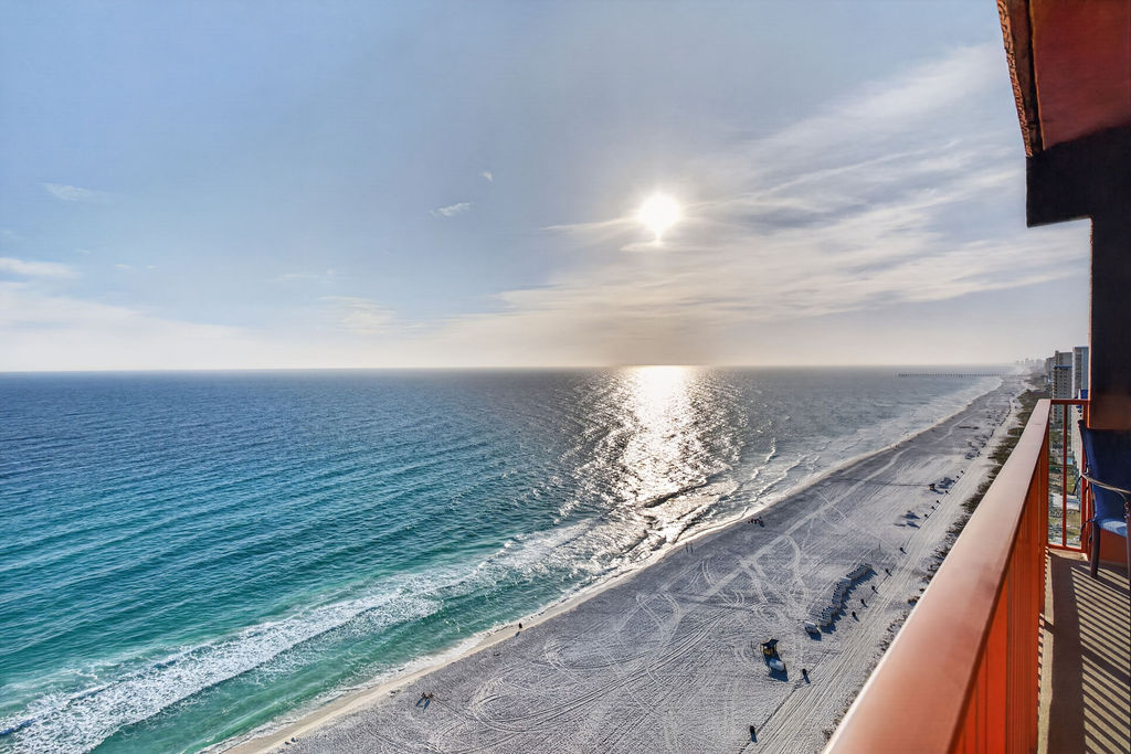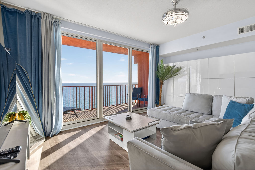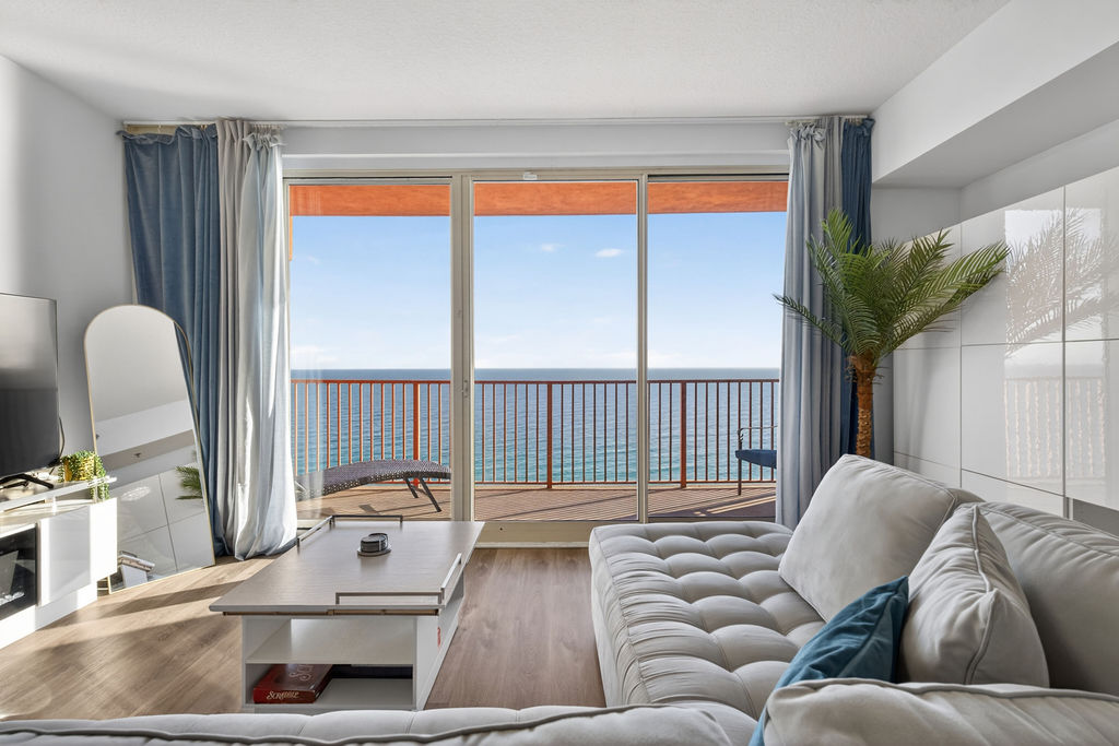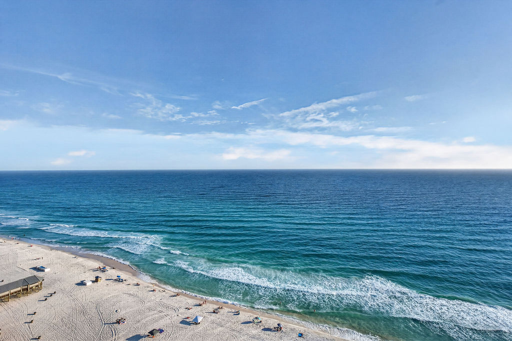 Kick your feet up and take in a breathtaking view of the Gulf waves! This beautiful condo hosts up to 4 guests comfortably! From this 21st floor furnished balcony see nothing but the sun over the ocean! The one bedroom unit offers a King bed in the bedroom and a Twin bunk bed alcove both with ensuite bathrooms. Full kitchen with essentials, full sized refrigerator, washer, and dryer. Fully vacation ready! This condo also has a reserved parking spot on the 3rd floor! Shores of Panama Resort is also right across the street from Walmart, convenient for anything you could possibly need during your vacation!