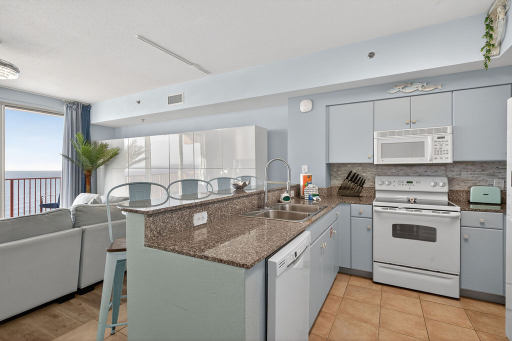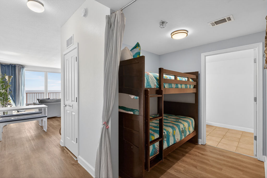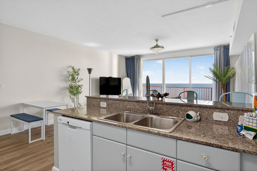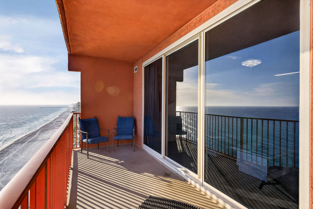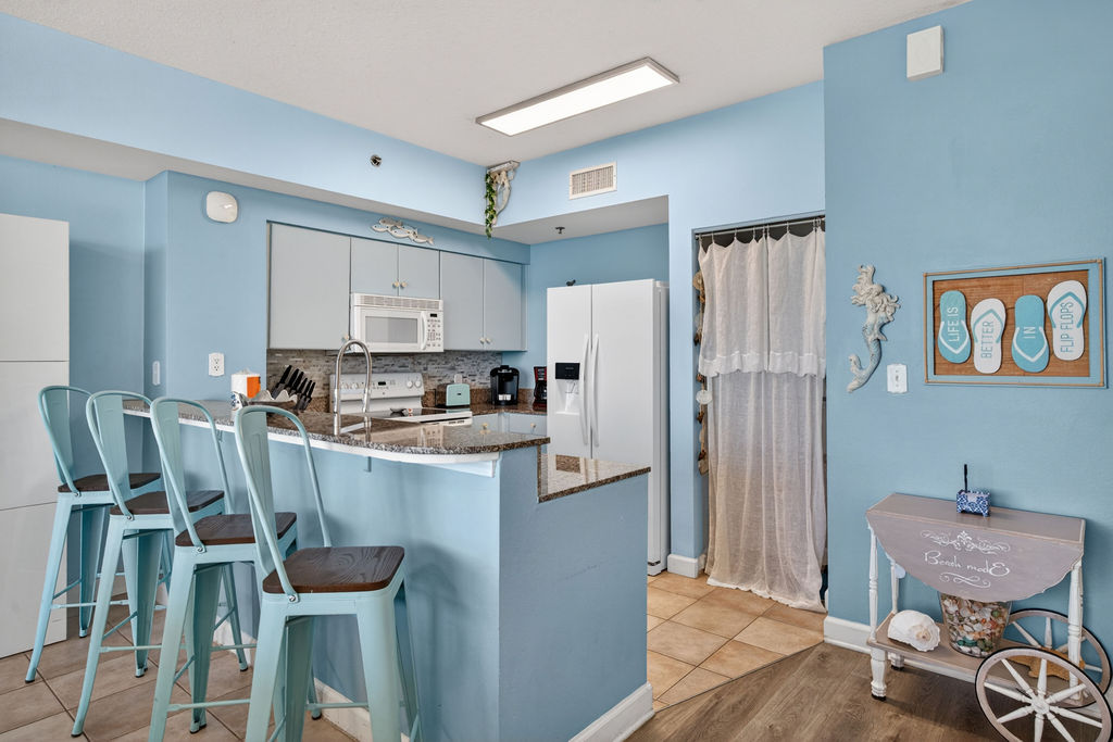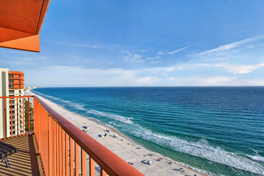 Kick your feet up and take in a breathtaking view of the Gulf waves! This beautiful condo hosts up to 4 guests comfortably! From this 21st floor furnished balcony see nothing but the sun over the ocean! The one bedroom unit offers a King bed in the bedroom and a Twin bunk bed alcove both with ensuite bathrooms. Full kitchen with essentials, full sized refrigerator, washer, and dryer. Fully vacation ready! This condo also has a reserved parking spot on the 3rd floor! Shores of Panama Resort is also right across the street from Walmart, convenient for anything you could possibly need during your vacation!