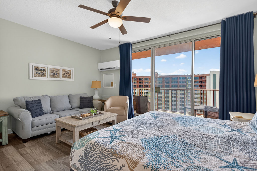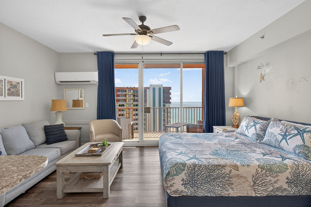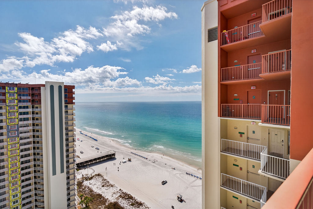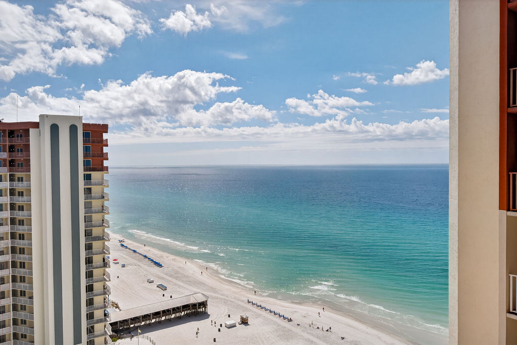 This colorful and cozy studio is the perfect vacation oasis! The horseshoe shape of this building allows a unique seclusion from the city outside! When you wake, open your eyes to a breathtaking view of the Gulf waves. From this 21st floor furnished balcony see nothing but the massive lagoon style oasis pool hideaway and the sun over the ocean! Shores of Panama Resort is also right across the street from Walmart, convenient for anything you could possibly need during your vacation!