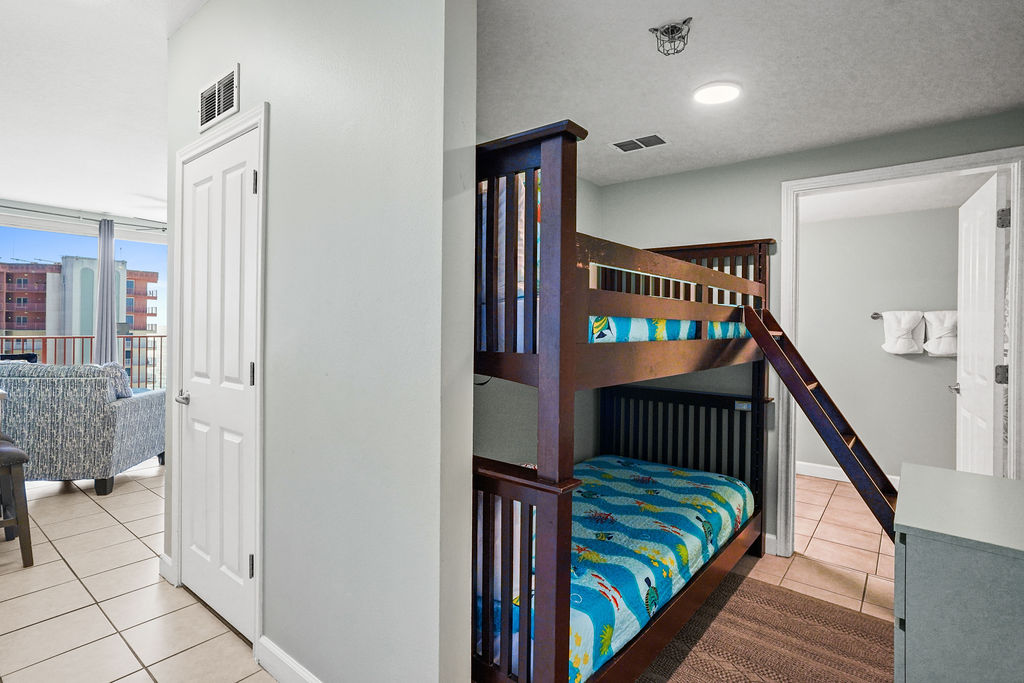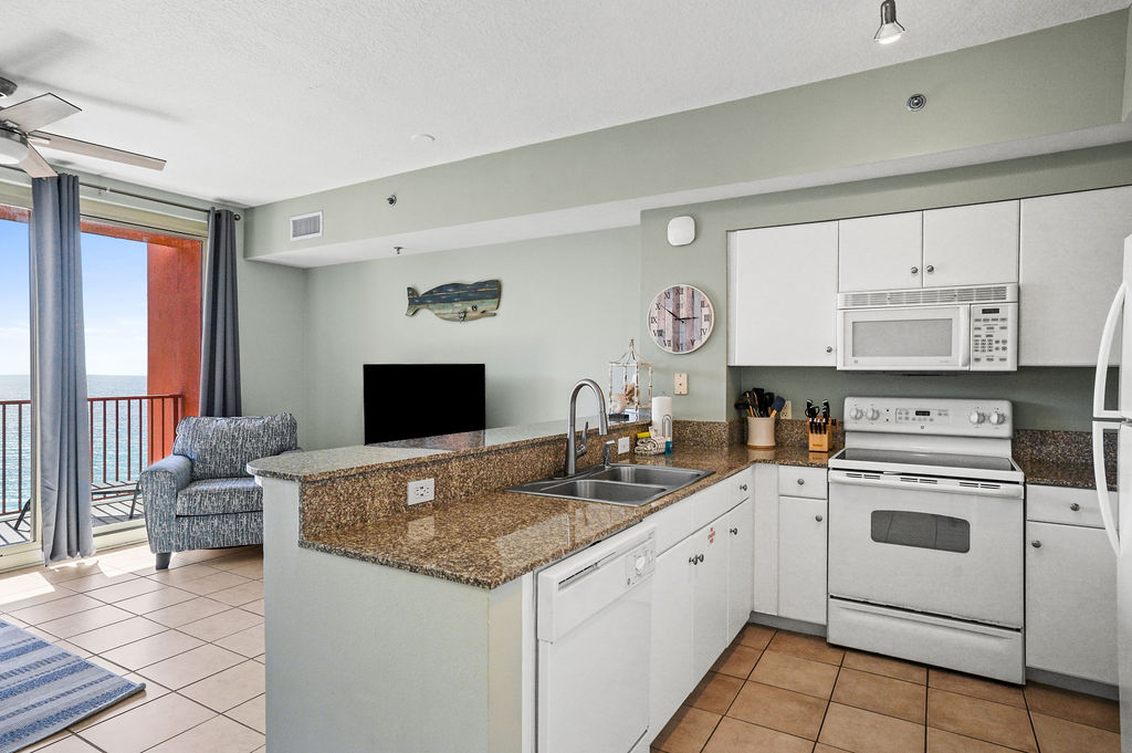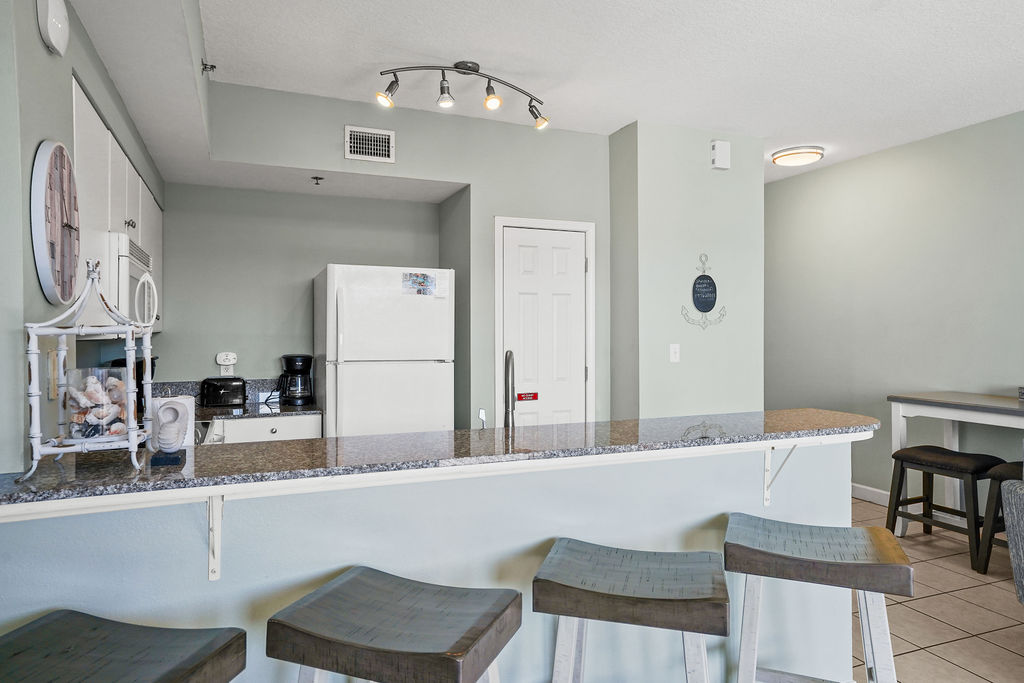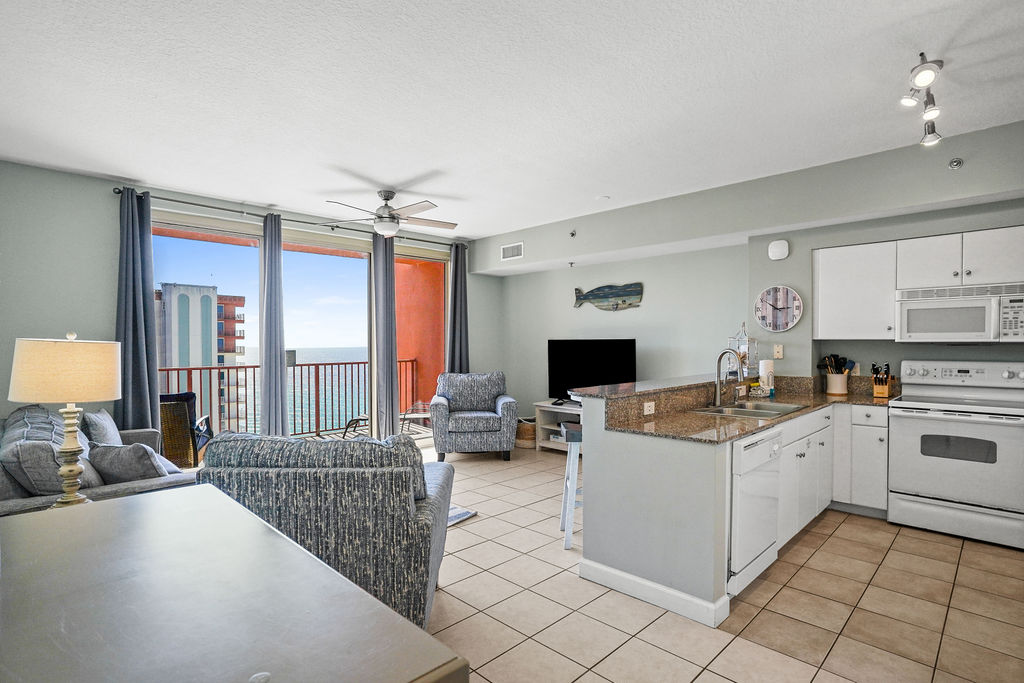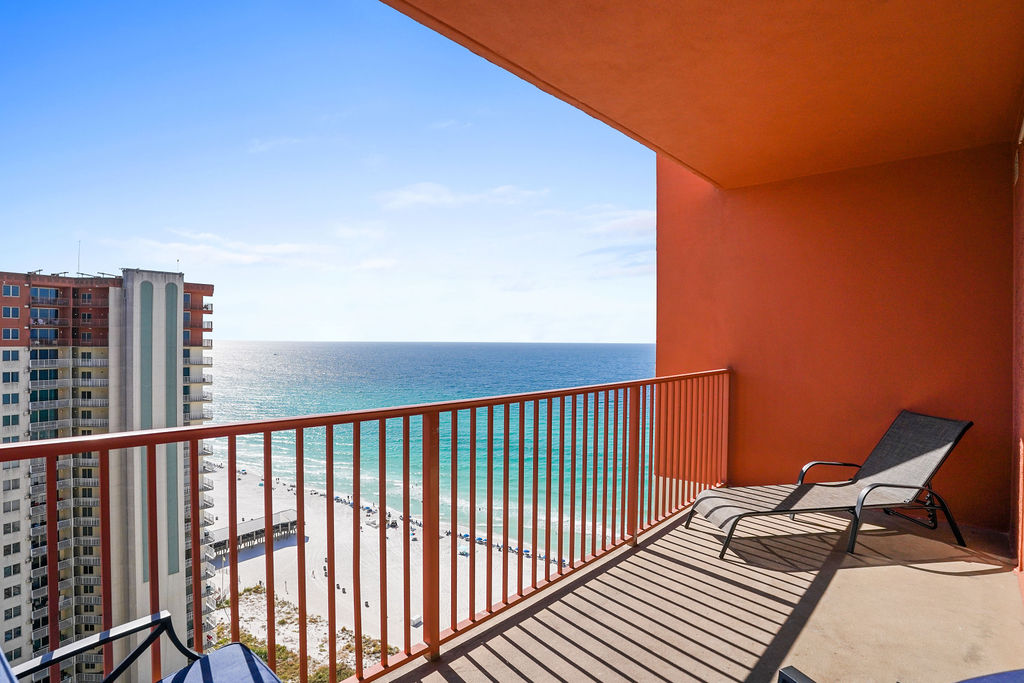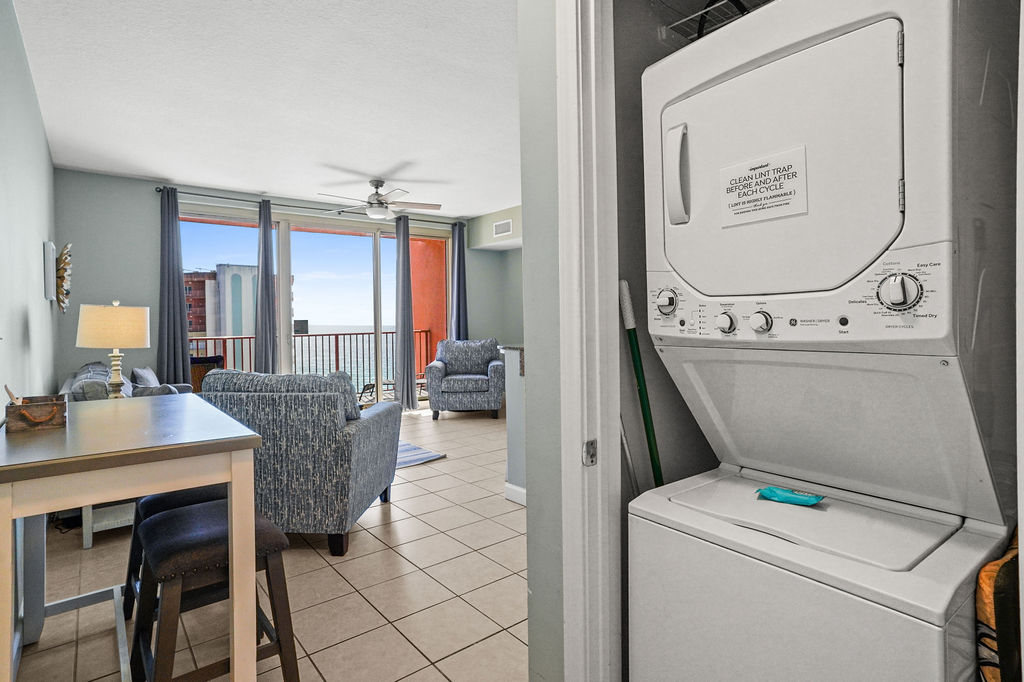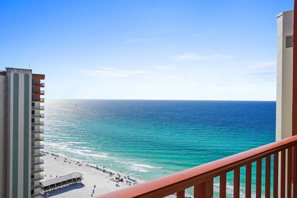 Kick your feet up and take in a breathtaking view of the Gulf waves! This beautiful condo hosts up to 6 guests comfortably! The horseshoe shape of this building allows a unique seclusion from the city outside! From this 21st floor furnished balcony see nothing but the massive lagoon style oasis pool hideaway and the sun over the ocean! The one bedroom unit offers a King bed in the bedroom, Twin bunk beds and Queen sleeper sofa. Full kitchen with essentials, full sized refrigerator and washer and dryer. Fully vacation ready! This condo even has reserved parking and beach chair rentals included! Shores of Panama Resort is also right across the street from Walmart, convenient for anything you could possibly need during your vacation!