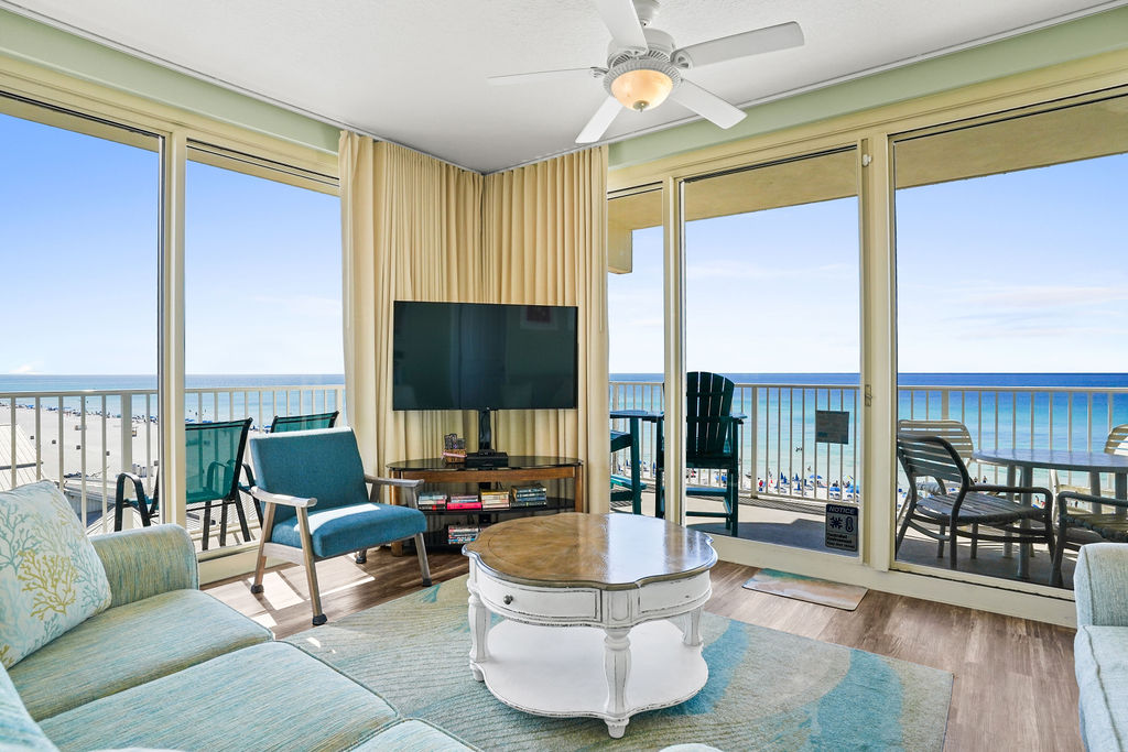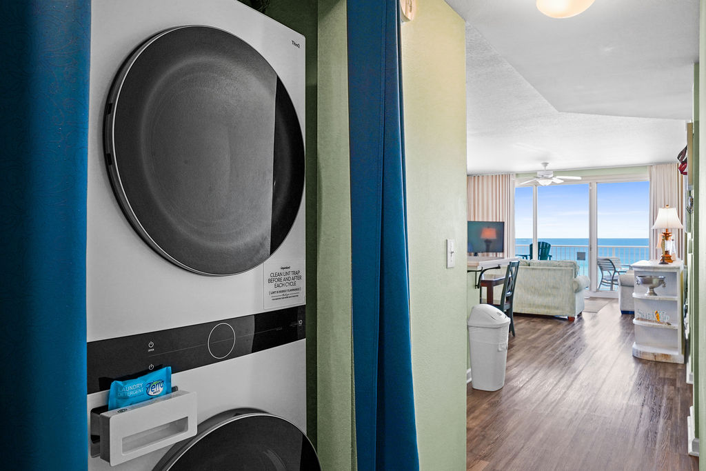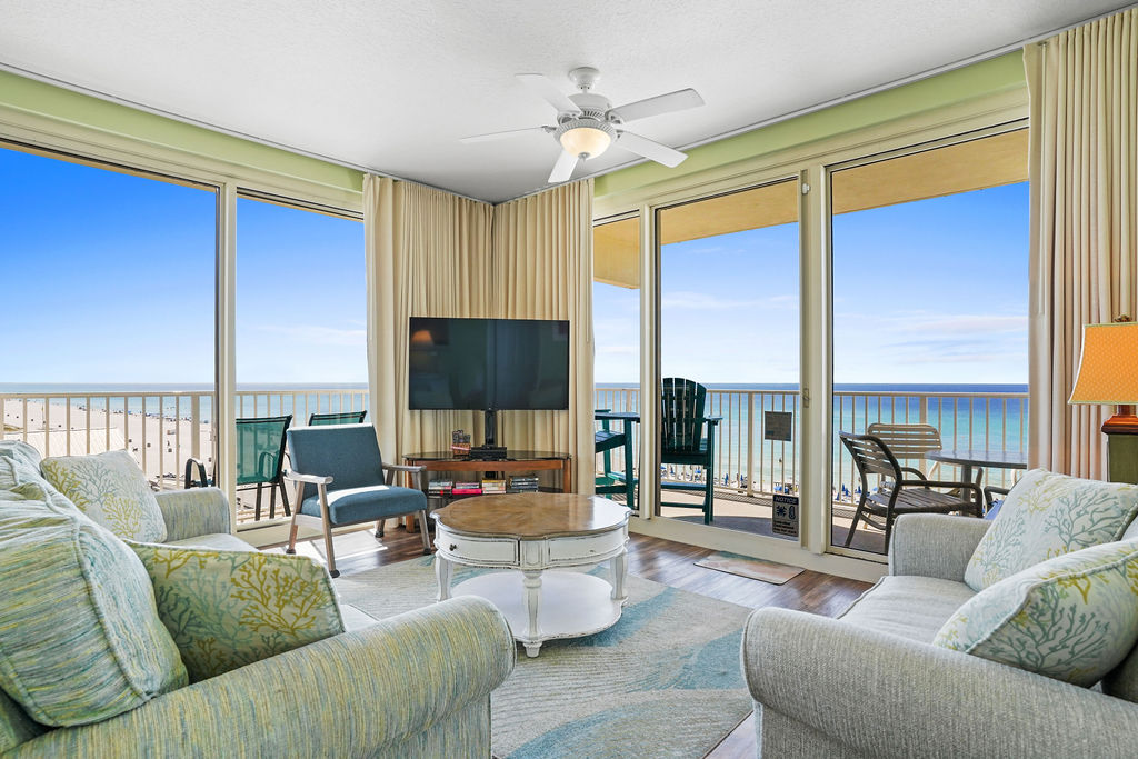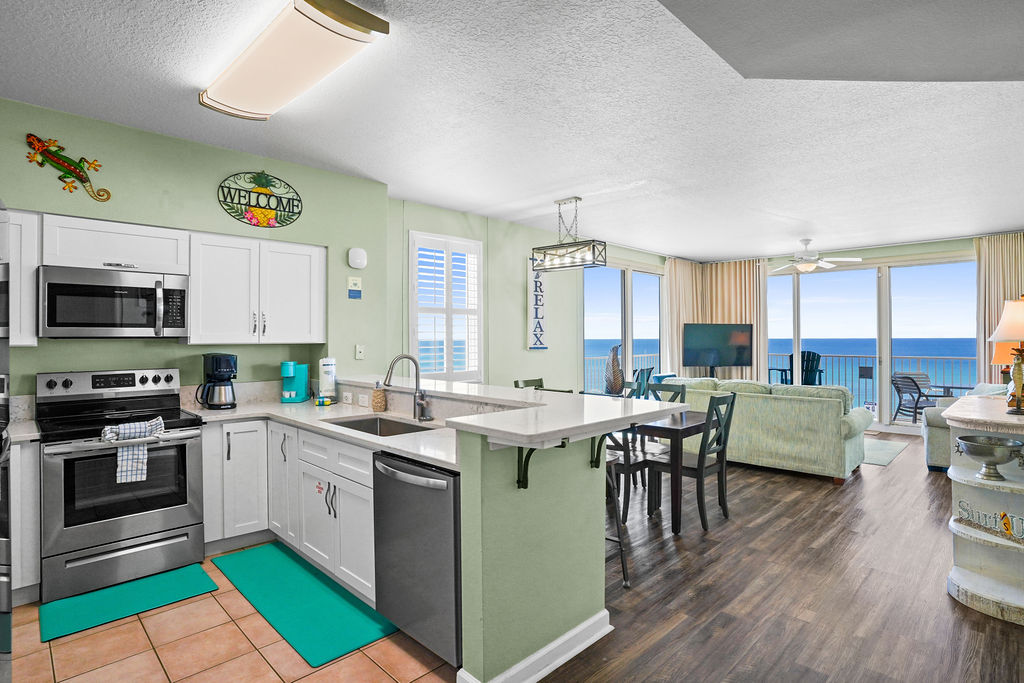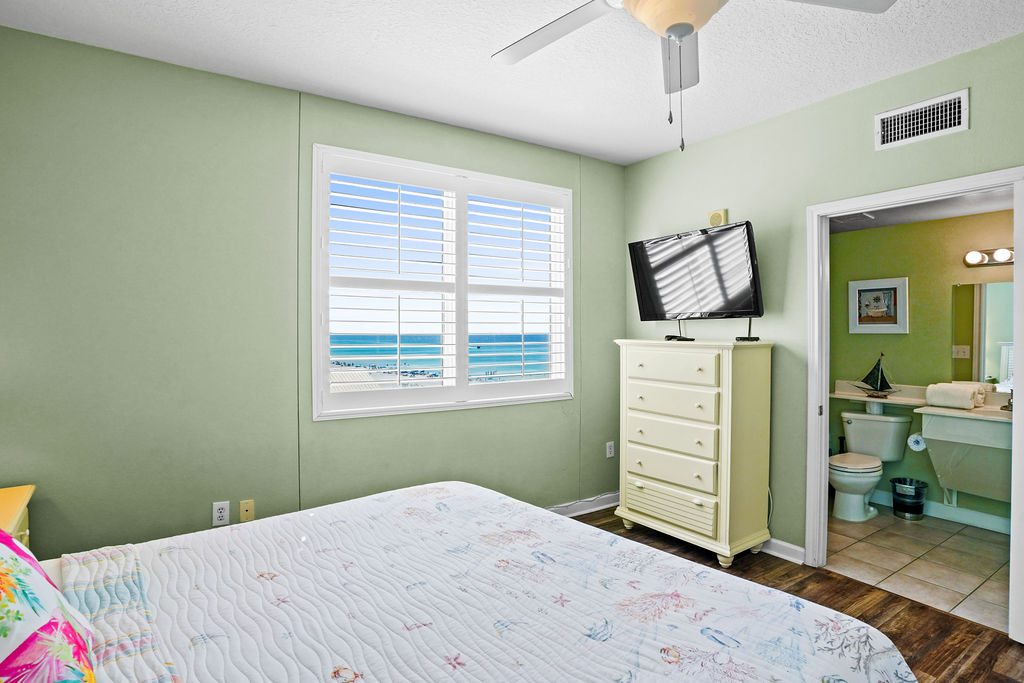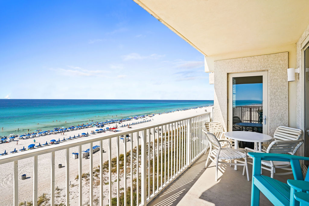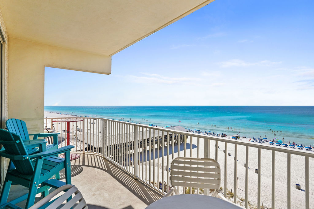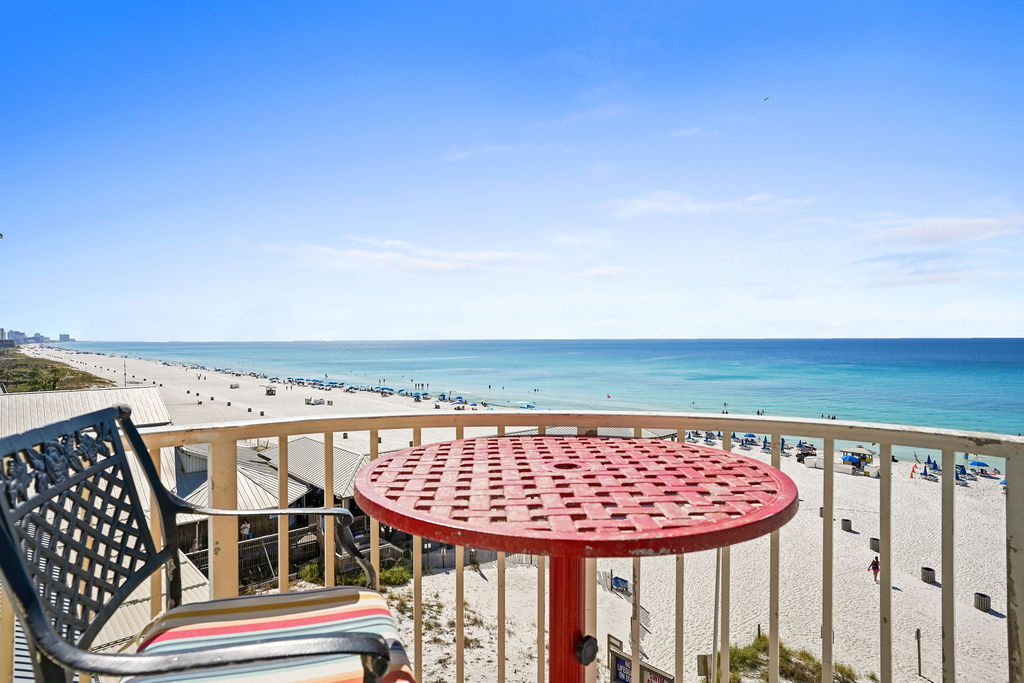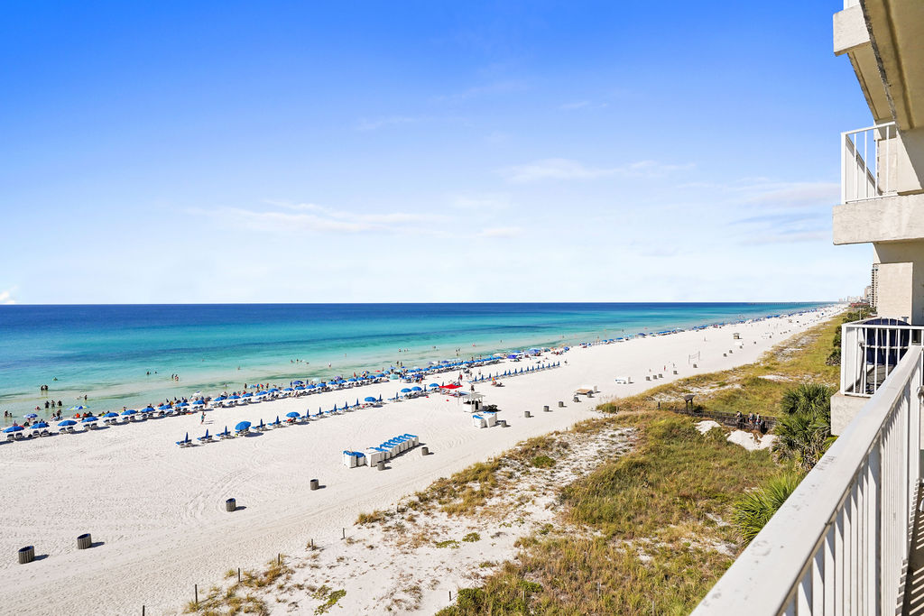 Bring the whole family for some fun in the sun! This beautiful condo hosts up to 8 guests comfortably! The horseshoe shape of this building allows a unique seclusion from the city outside! When sitting on your furnished, 5th floor balcony you have a breathtaking unobstructed view of the ocean! This 3 bedroom unit offers two King bedrooms, a Queen bedroom all with full ensuite bathrooms and a sofa bed in the living room. Full kitchen with essentials, full sized refrigerator, washer, and dryer. Fully vacation ready! This condo also has 2 reserved parking spots on the same floor! Shores of Panama Resort is also right across the street from Walmart, convenient for anything you could possibly need during your vacation!