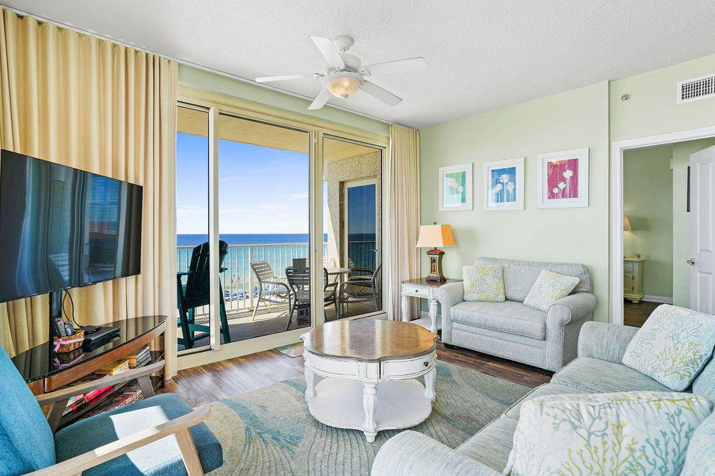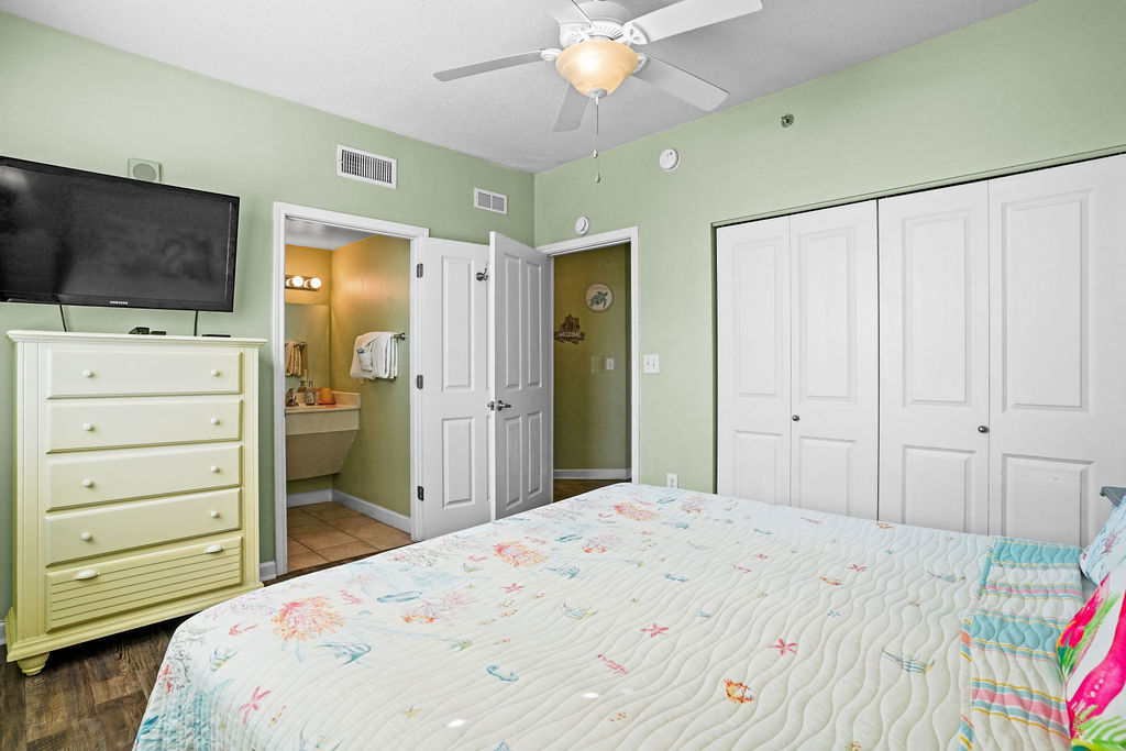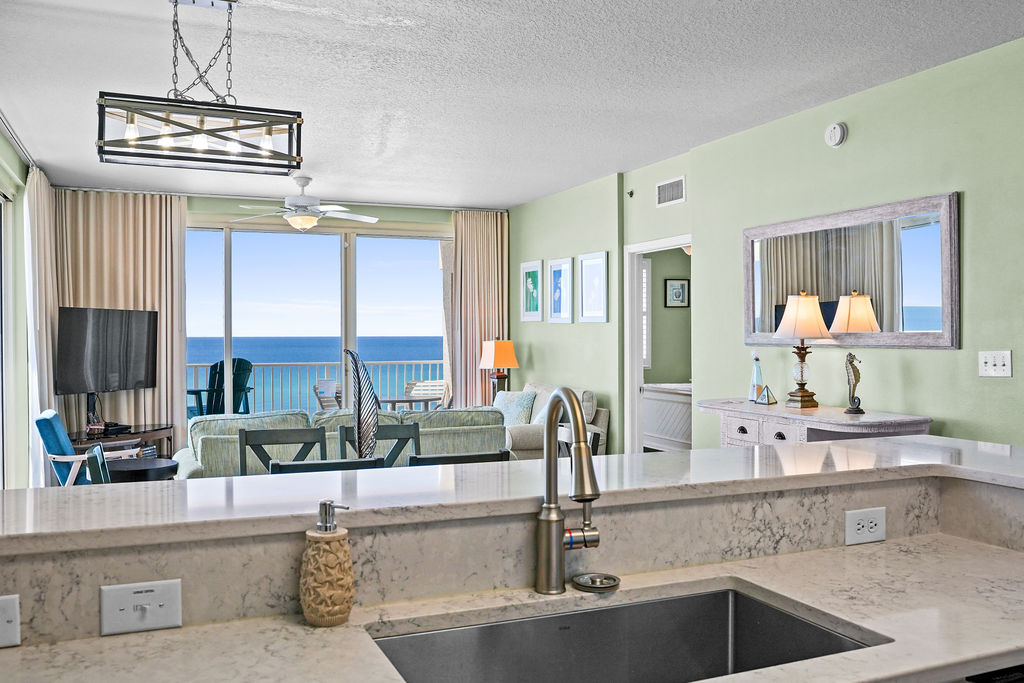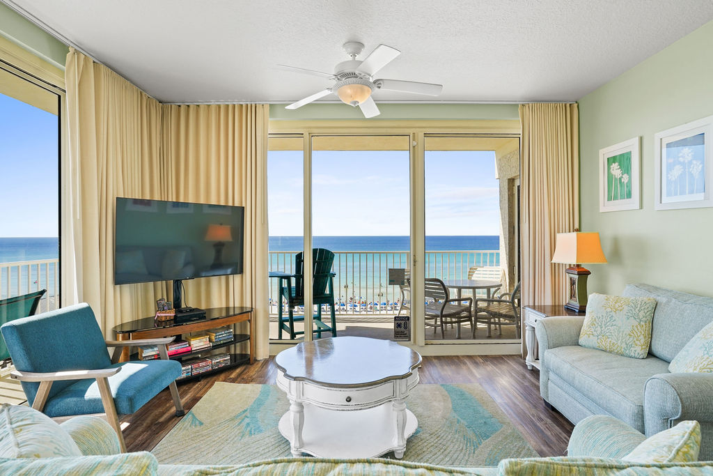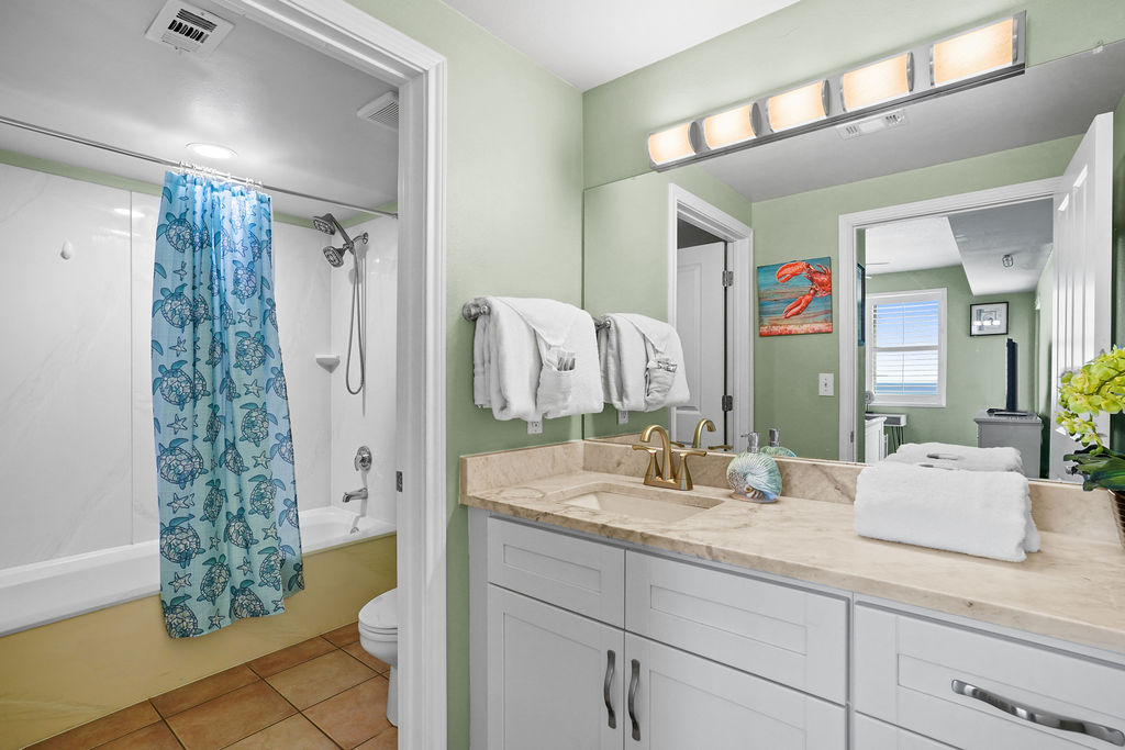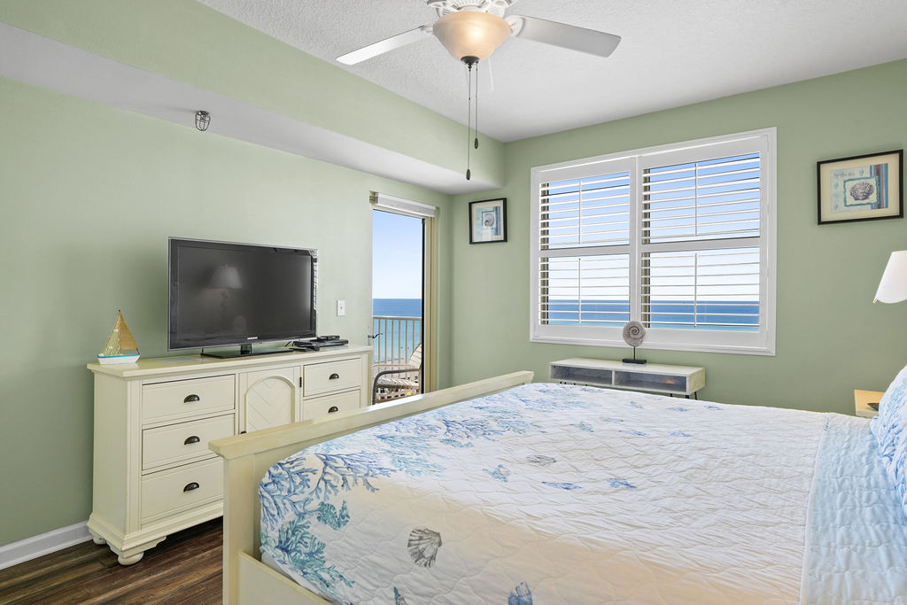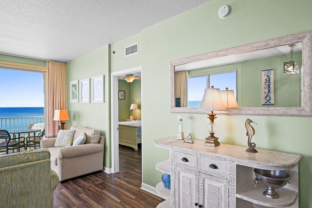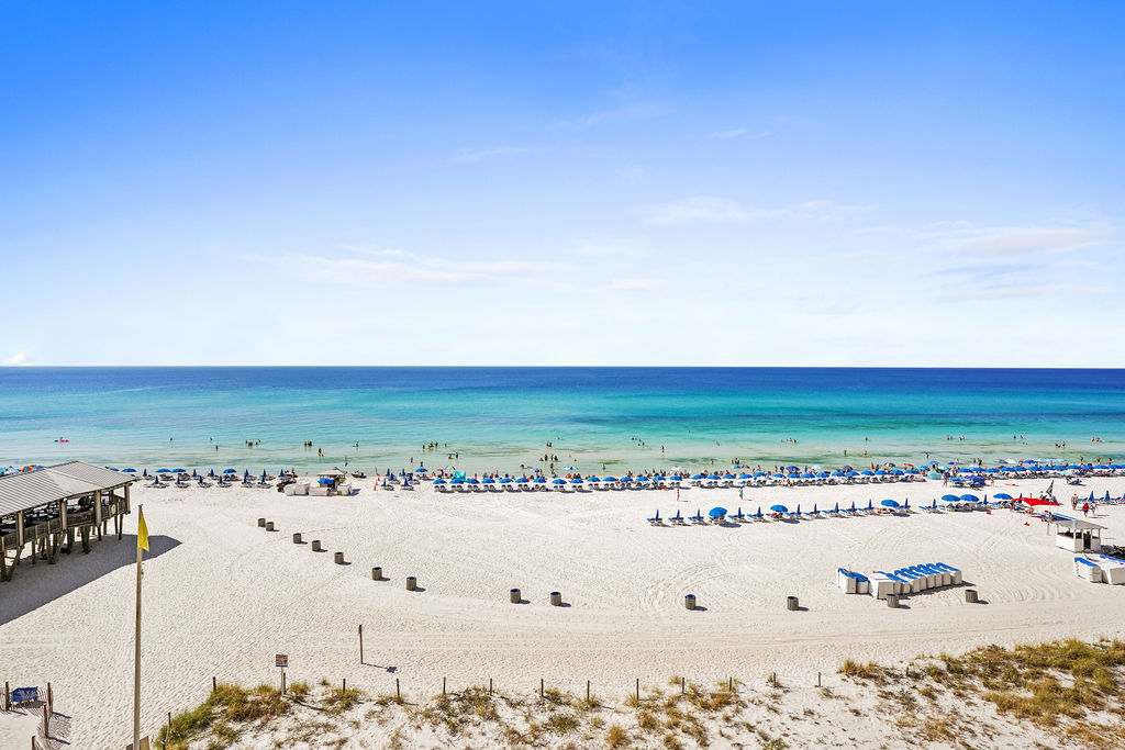Bring the whole family for some fun in the sun! This beautiful condo hosts up to 8 guests comfortably! The horseshoe shape of this building allows a unique seclusion from the city outside! When sitting on your furnished, 5th floor balcony you have a breathtaking unobstructed view of the ocean! This 3 bedroom unit offers two King bedrooms, a Queen bedroom all with full ensuite bathrooms and a sofa bed in the living room. Full kitchen with essentials, full sized refrigerator, washer, and dryer. Fully vacation ready! This condo also has 2 reserved parking spots on the same floor! Shores of Panama Resort is also right across the street from Walmart, convenient for anything you could possibly need during your vacation!