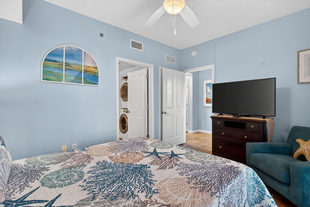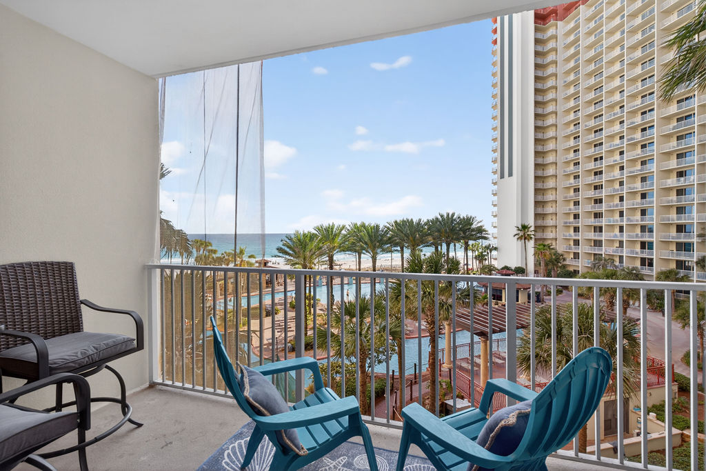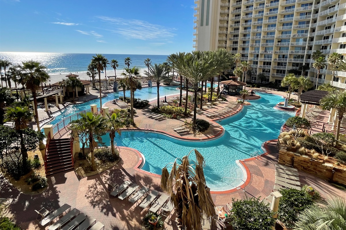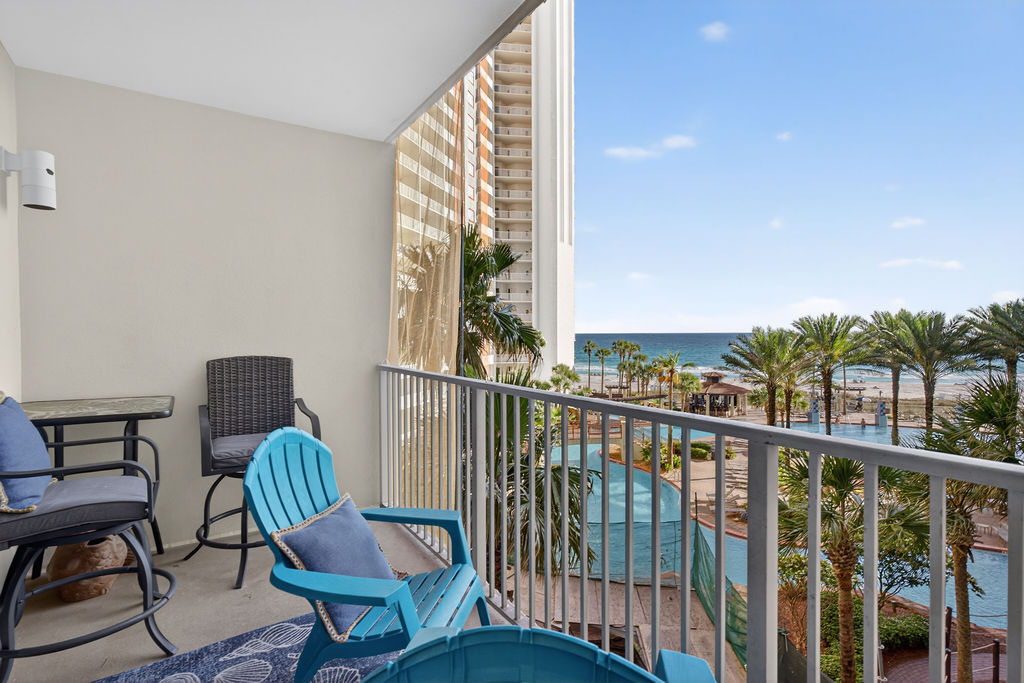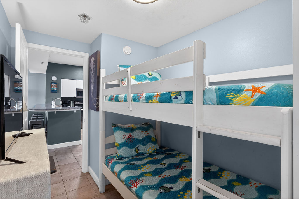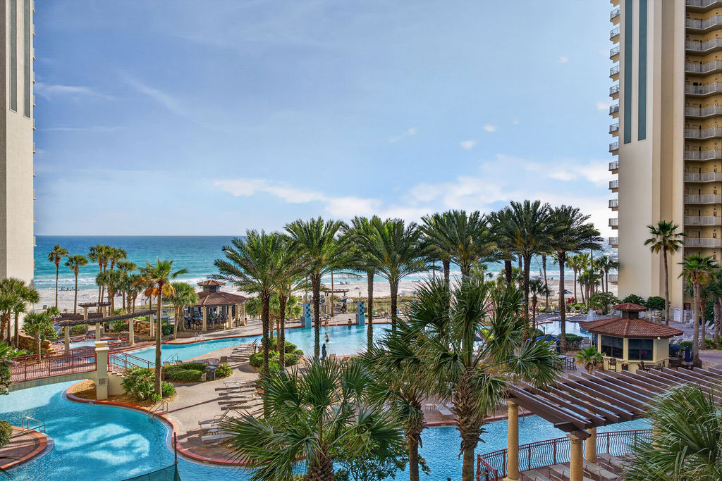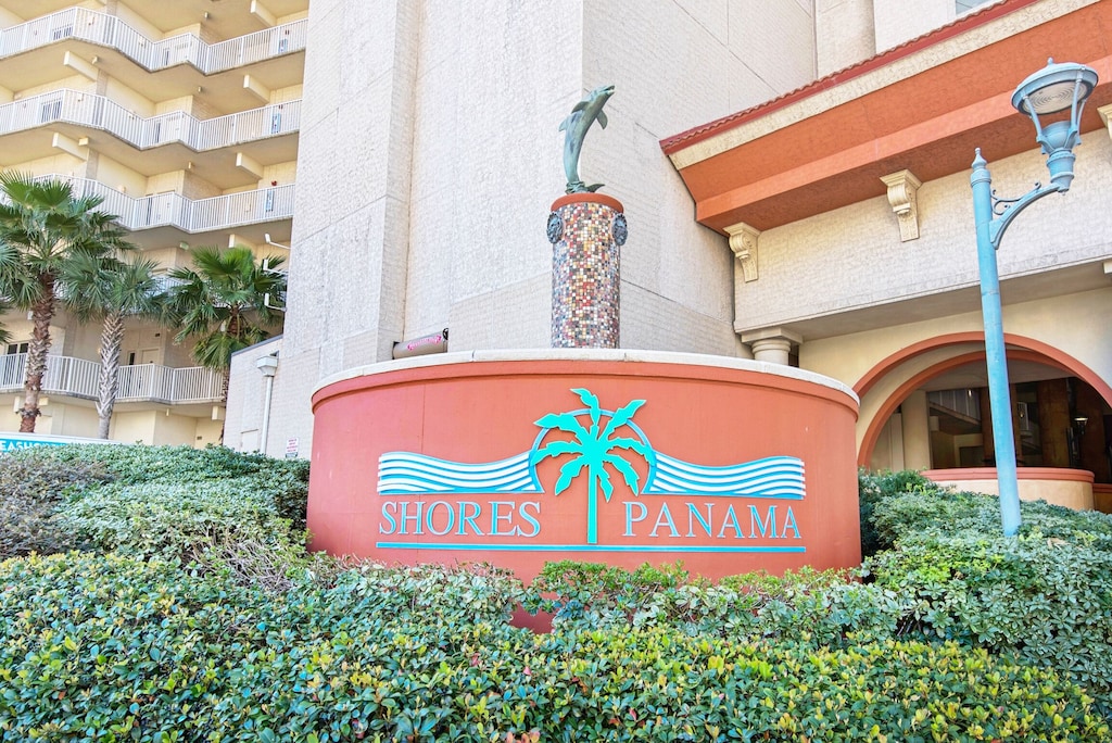 Bring the whole family for some fun in the sun! This beautiful condo hosts up to 8 guests comfortably! The horseshoe shape of this building allows a unique seclusion from the city outside! From this 4th floor furnished balcony see nothing but the massive lagoon style oasis pool hideaway and the sun over the ocean! This two bedroom unit offers one King bed and one Queen bed in the bedrooms, Twin bunk bed area and a Queen sleeper sofa. Full kitchen with essentials, full sized refrigerator, washer, and dryer. Fully vacation ready! This condo has same floor reserved parking for no need to use an elevator! Shores of Panama Resort is also right across the street from Walmart, convenient for anything you could possibly need during your vacation!
