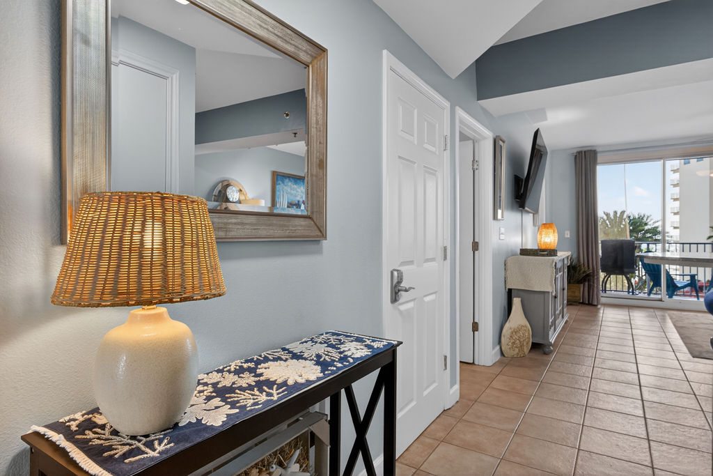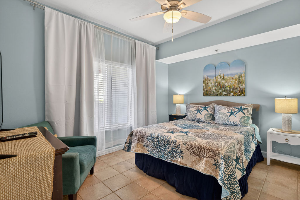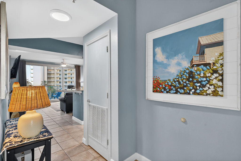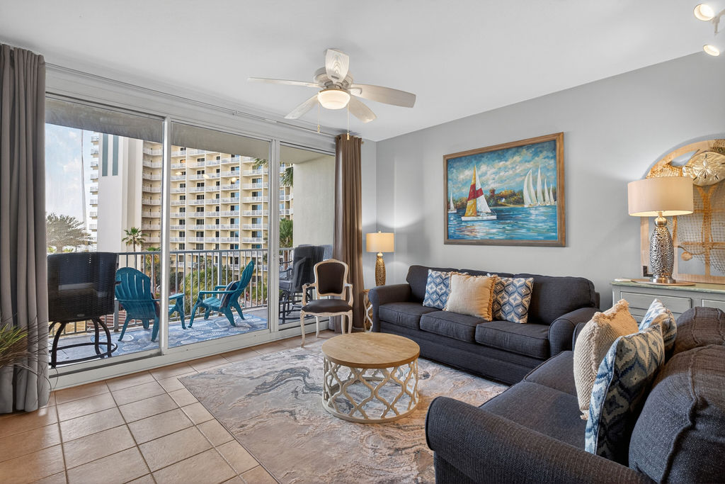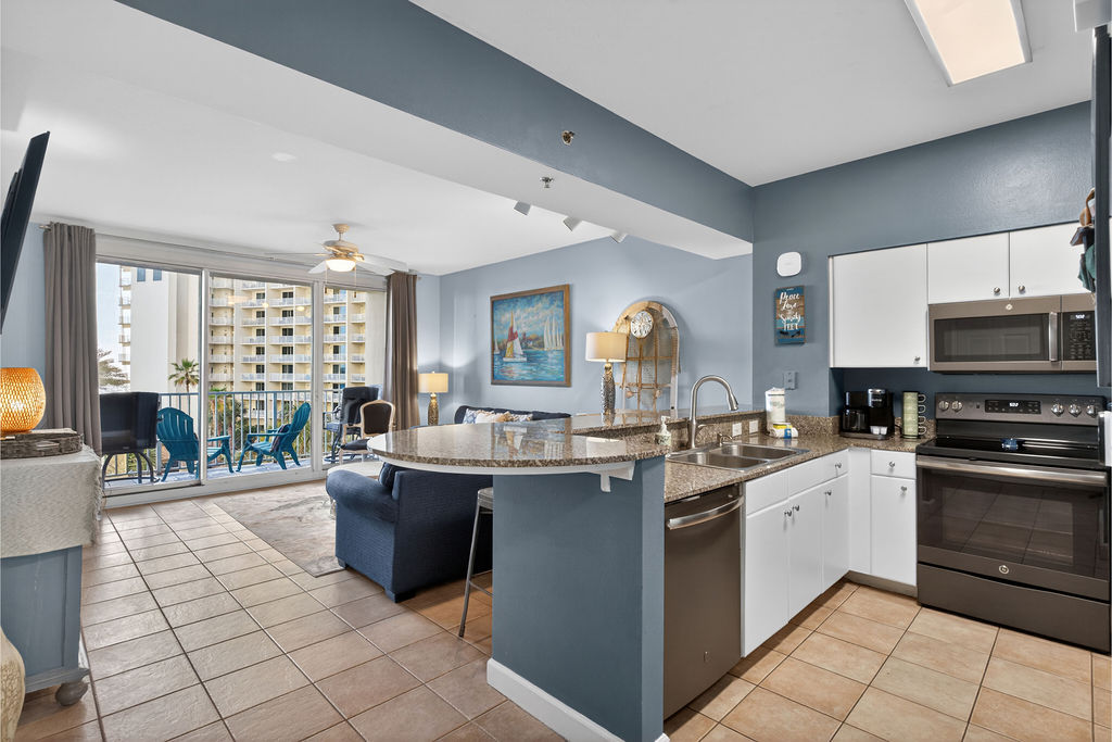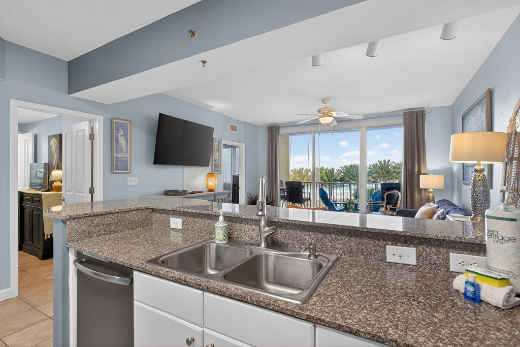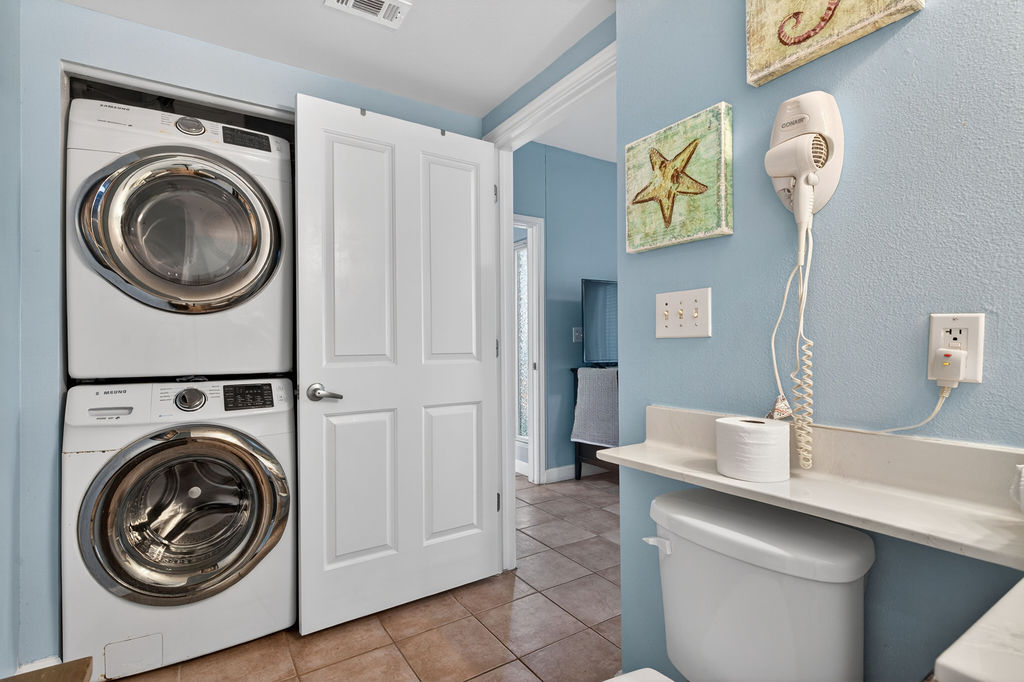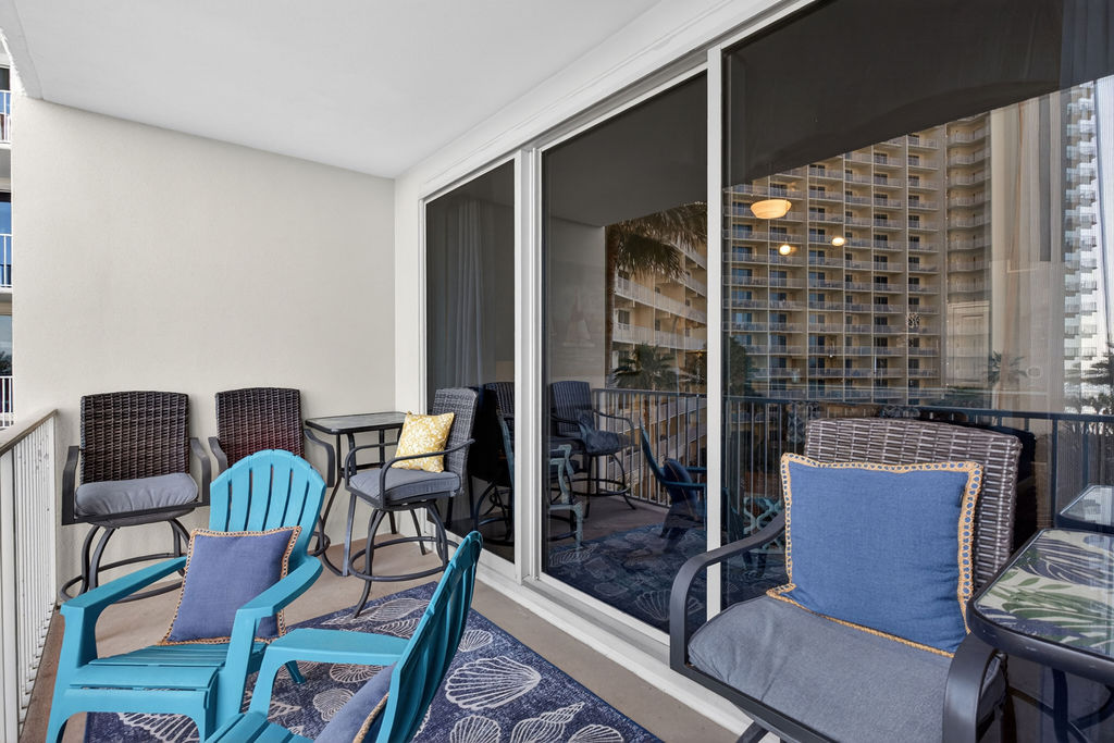 Bring the whole family for some fun in the sun! This beautiful condo hosts up to 8 guests comfortably! The horseshoe shape of this building allows a unique seclusion from the city outside! From this 4th floor furnished balcony see nothing but the massive lagoon style oasis pool hideaway and the sun over the ocean! This two bedroom unit offers one King bed and one Queen bed in the bedrooms, Twin bunk bed area and a Queen sleeper sofa. Full kitchen with essentials, full sized refrigerator, washer, and dryer. Fully vacation ready! This condo has same floor reserved parking for no need to use an elevator! Shores of Panama Resort is also right across the street from Walmart, convenient for anything you could possibly need during your vacation!